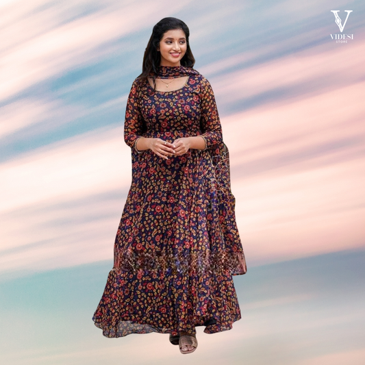 Indulge in the captivating allure of our Angelina Digital Printed Faux Georgette Gown with Crepe...