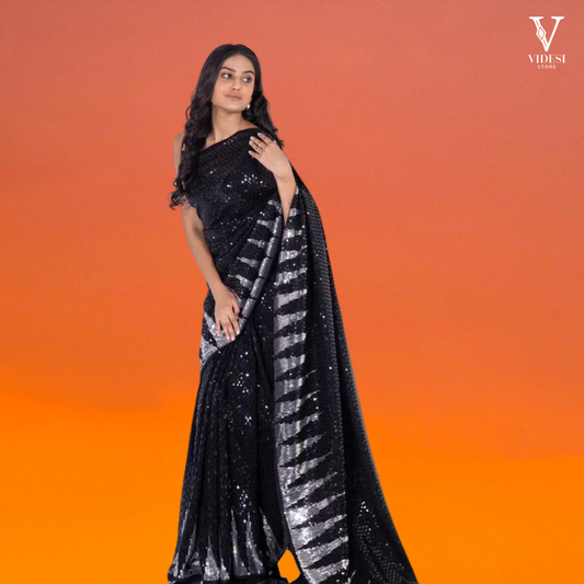 Elevate your style to breathtaking new heights with our exquisite Samantha Premium Black Georgette Saree...