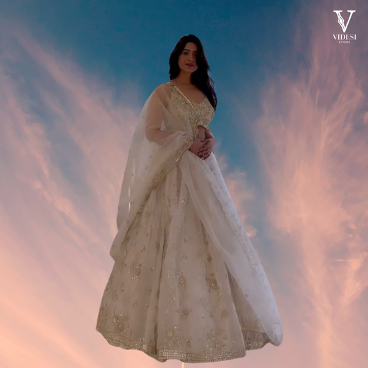 Ignite the spotlight with our mesmerizing Mena Classic White Embroidered Sequined Faux Georgette Lehenga! Indulge...