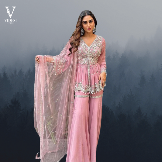 Experience elegance and style with our exquisite Micaela Blushing Pink Heavy Faux Georgette Embroidered Suit...