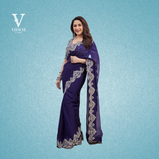 Get nothing but the best with this Genesis Stylish Blue Velvet Embroidered Cording Sequined Saree....