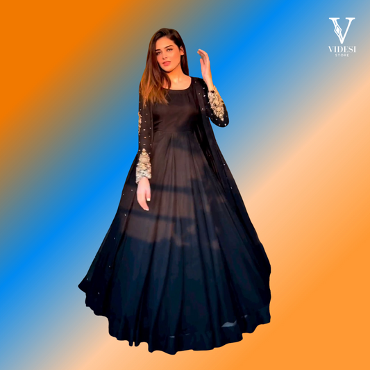 Introducing the Gracia Classic Black Faux Georgette With Riveted Moti Work Gown, crafted from premium...