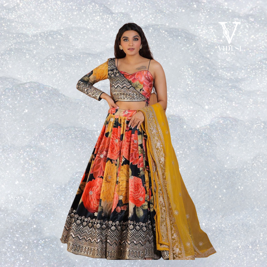 Feel like a Bollywood star in this stunning Irina Chic Printed Embroidered Faux Georgette Lehenga...
