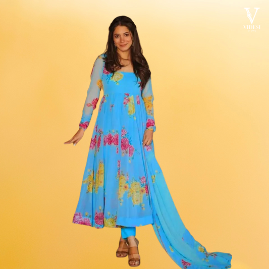 Indulge in the captivating allure of our Angelina Digital Printed Faux Georgette Gown with Crepe...