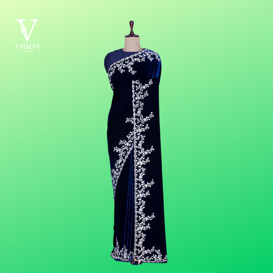 Experience a flamboyant and elegant look with this Ayla Flattering Printed Navy Blue Georgette Embroidered...