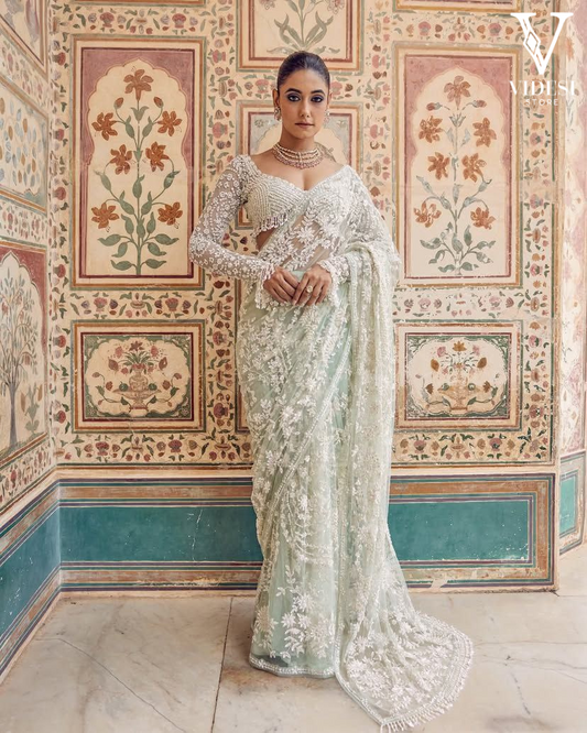 Indulge in luxury with our Caitlin Pristine Embroidered Sequined Mono Net Saree. Made of heavy...
