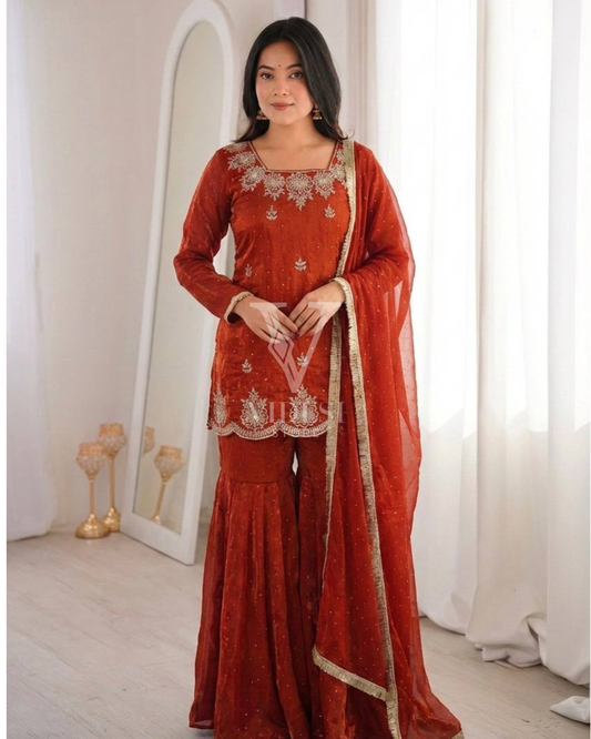 Discover the luxurious Donna Embroidered Sequined Heavy Chanderi Silk Suit. Crafted from heavy chanderi silk...