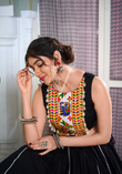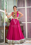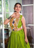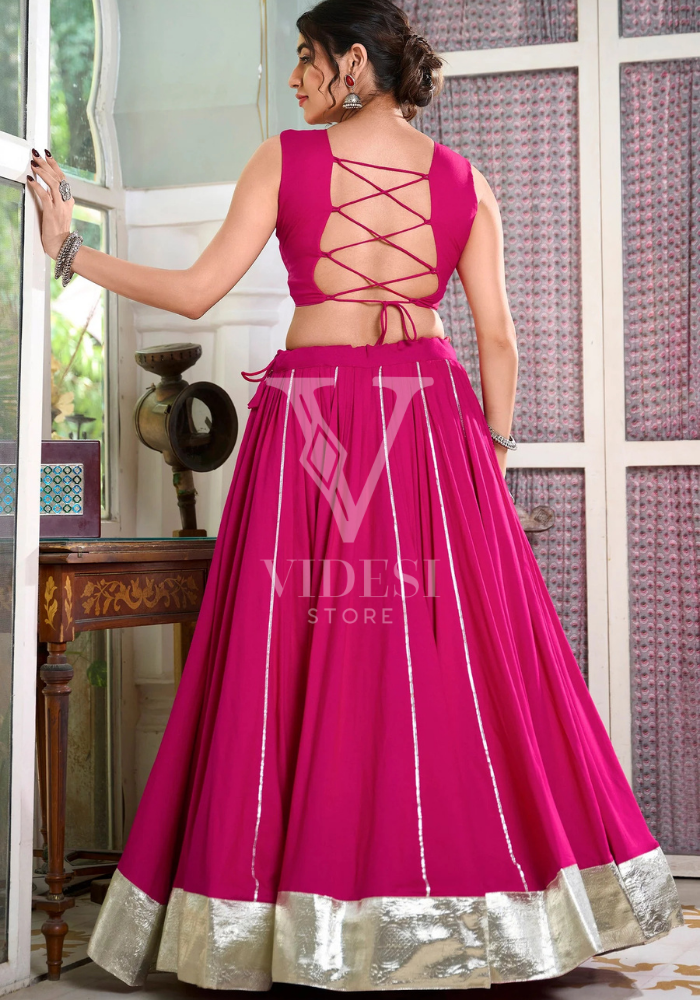 This Amira lehenga in rayon boldly blends plain fabric with a striking lace border and gotta patti accents. Its drawstring and zip closure promise both edge and ease, while the micro cotton lining ensures comfort. Paired with a fully stitched blouse featuring daring Gamthi work and cowrie lace, it’s an unforgettable look.