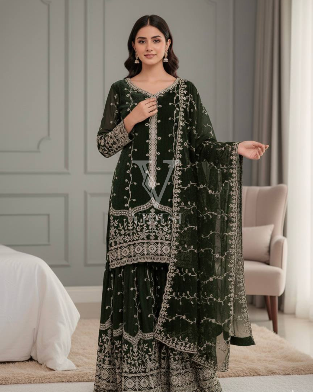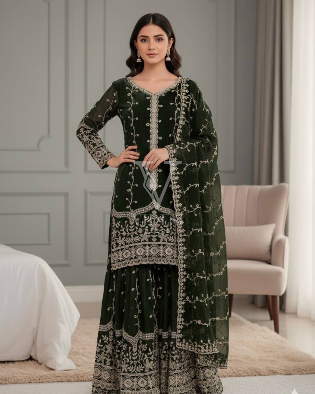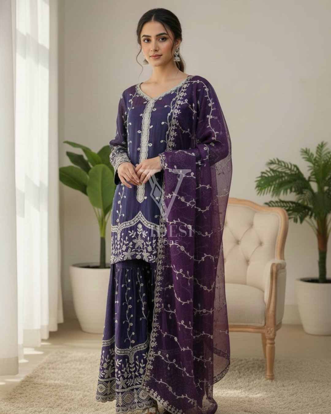 Get ready to dazzle in this luxurious silk Anette three-piece set where every piece—from the full-sleeved top to the flared bottom and matching dupatta—is adorned with gorgeous embroidery and sequin work that catches the light beautifully. Fully stitched and ready to wear with a breathable micro cotton lining, this playful three-piece set comes in multiple sizes for the perfect fit.