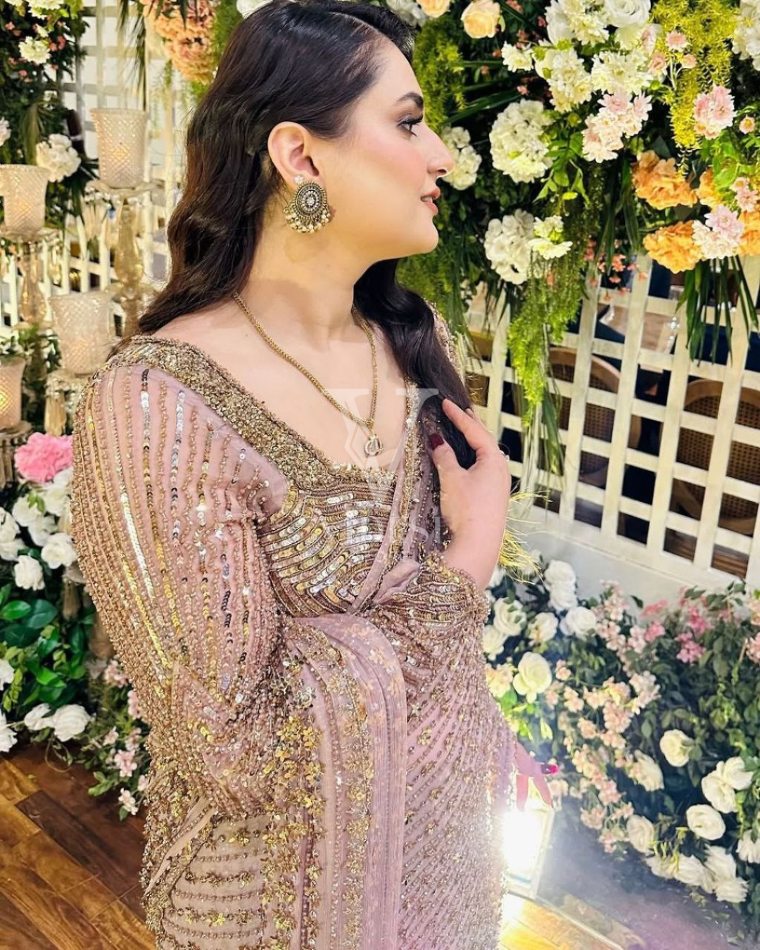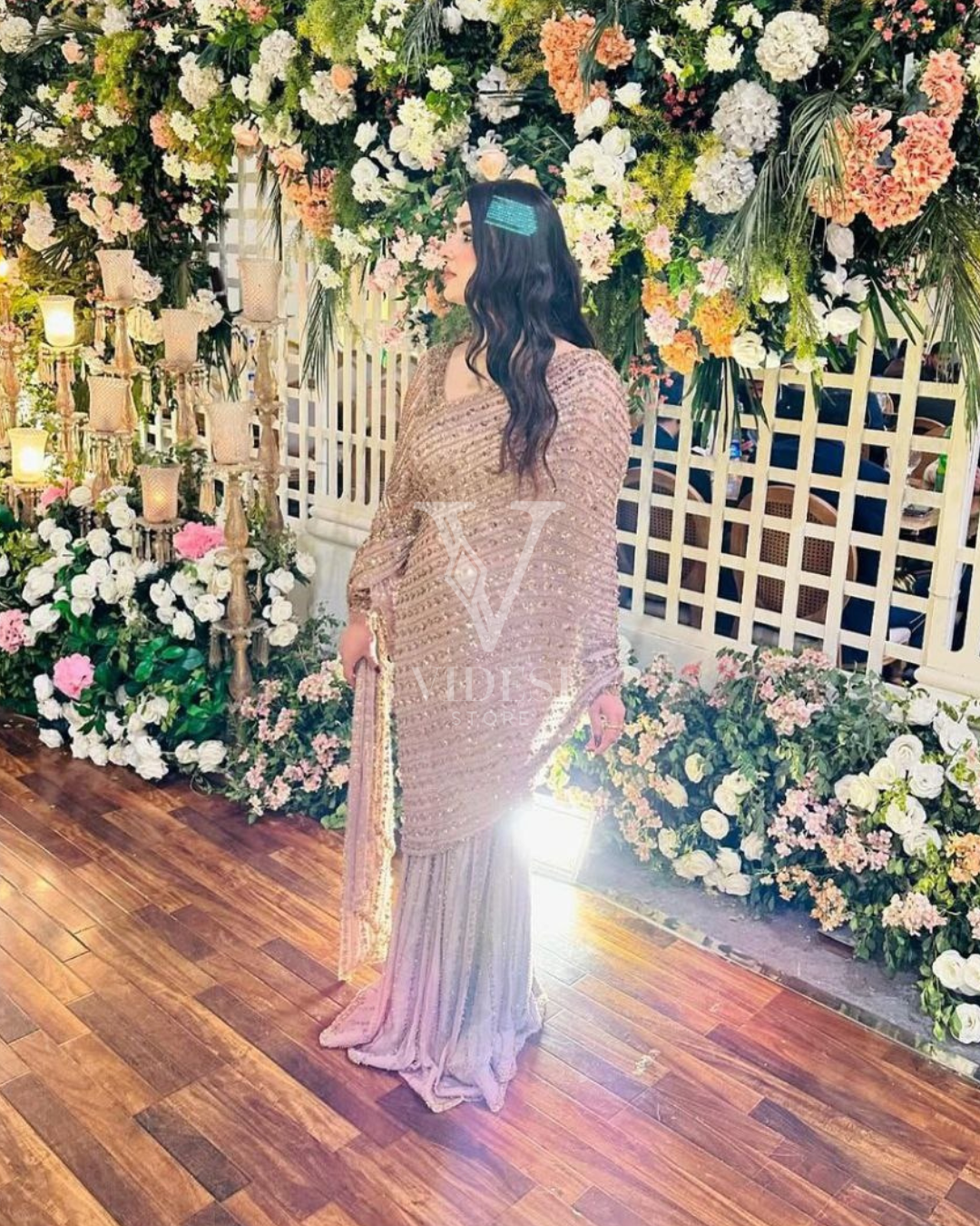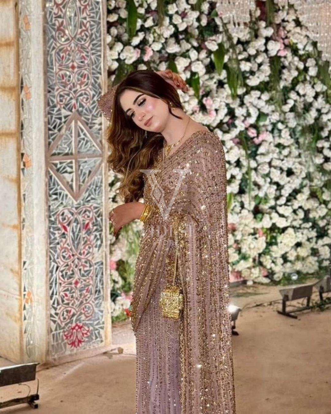 Dazzle in this Faiza premium butterfly net saree beautifully adorned with shimmering sequins, paired with a matching sequin-embellished blouse featuring stunning front, back, and sleeve work. A perfect blend of grace and sparkle for your next special occasion.