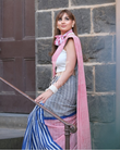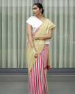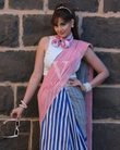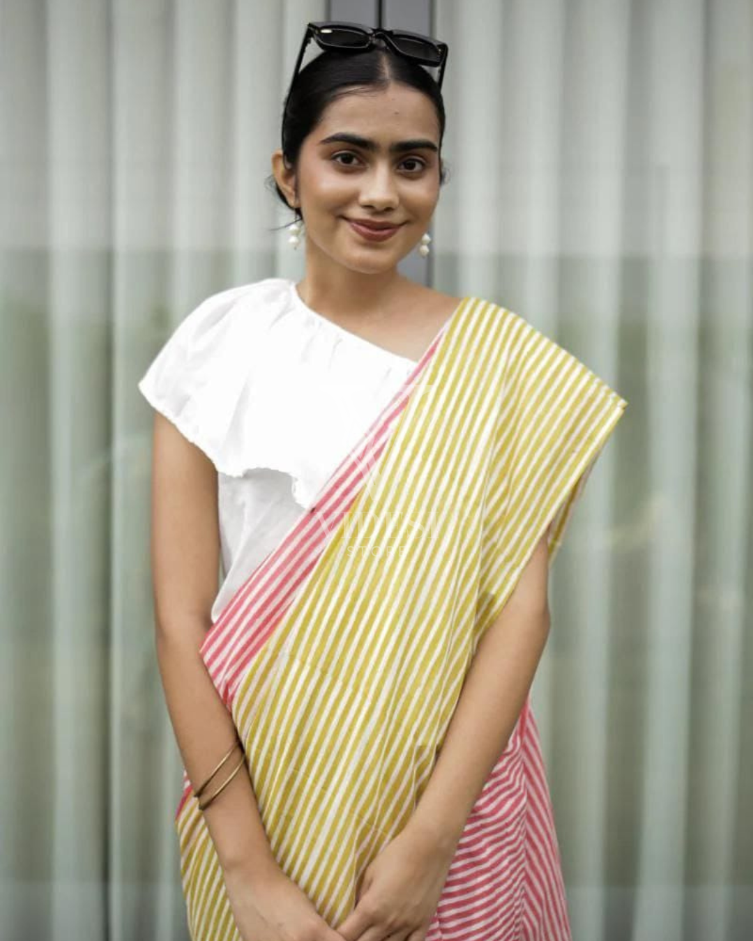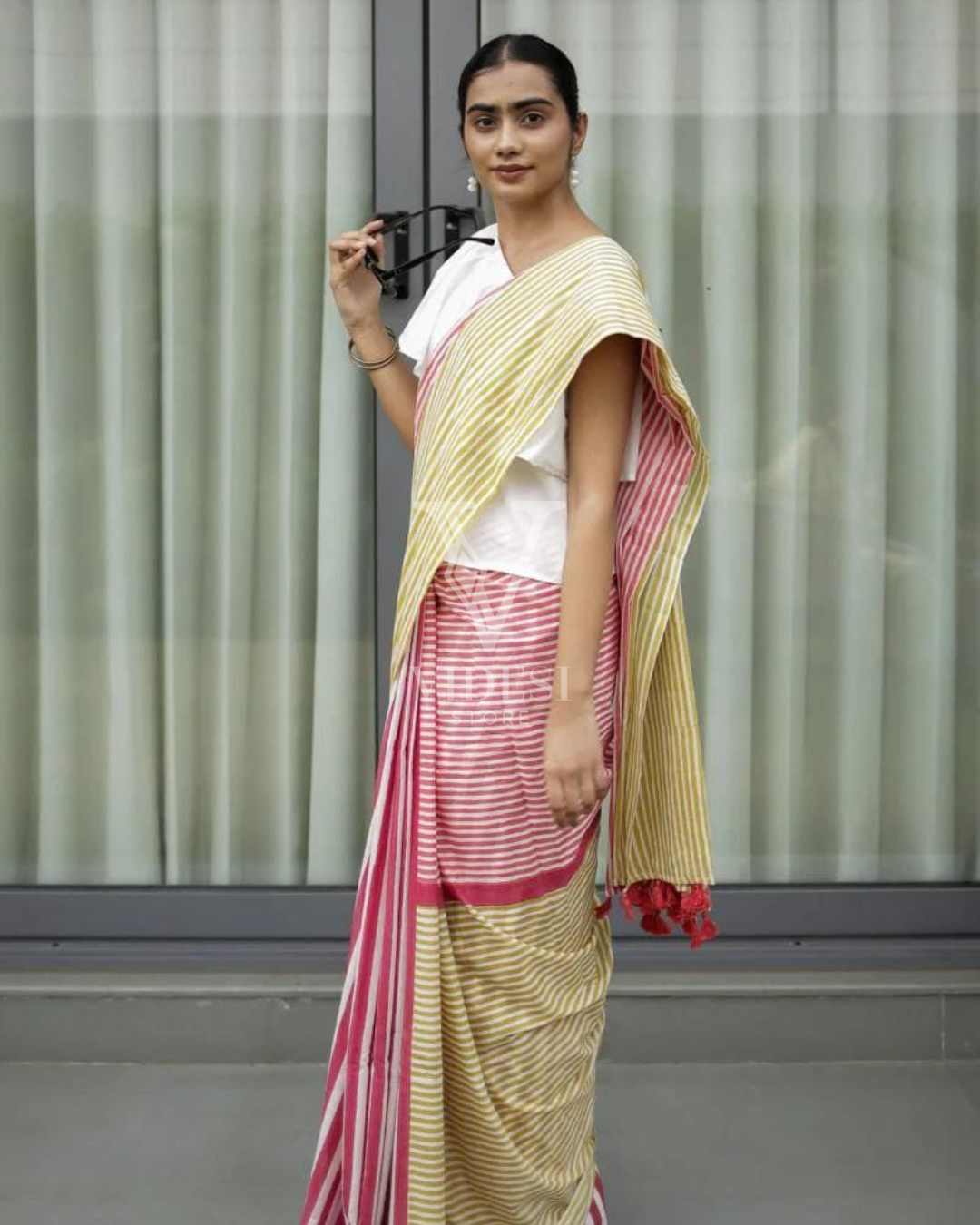 Effortlessly elegant, this plain linen saree features vibrant digital prints and charming fumka (latakan) tassel detailing, paired with a matching digitally printed blouse for a stylish modern touch. A perfect blend of simplicity and statement for any occasion.