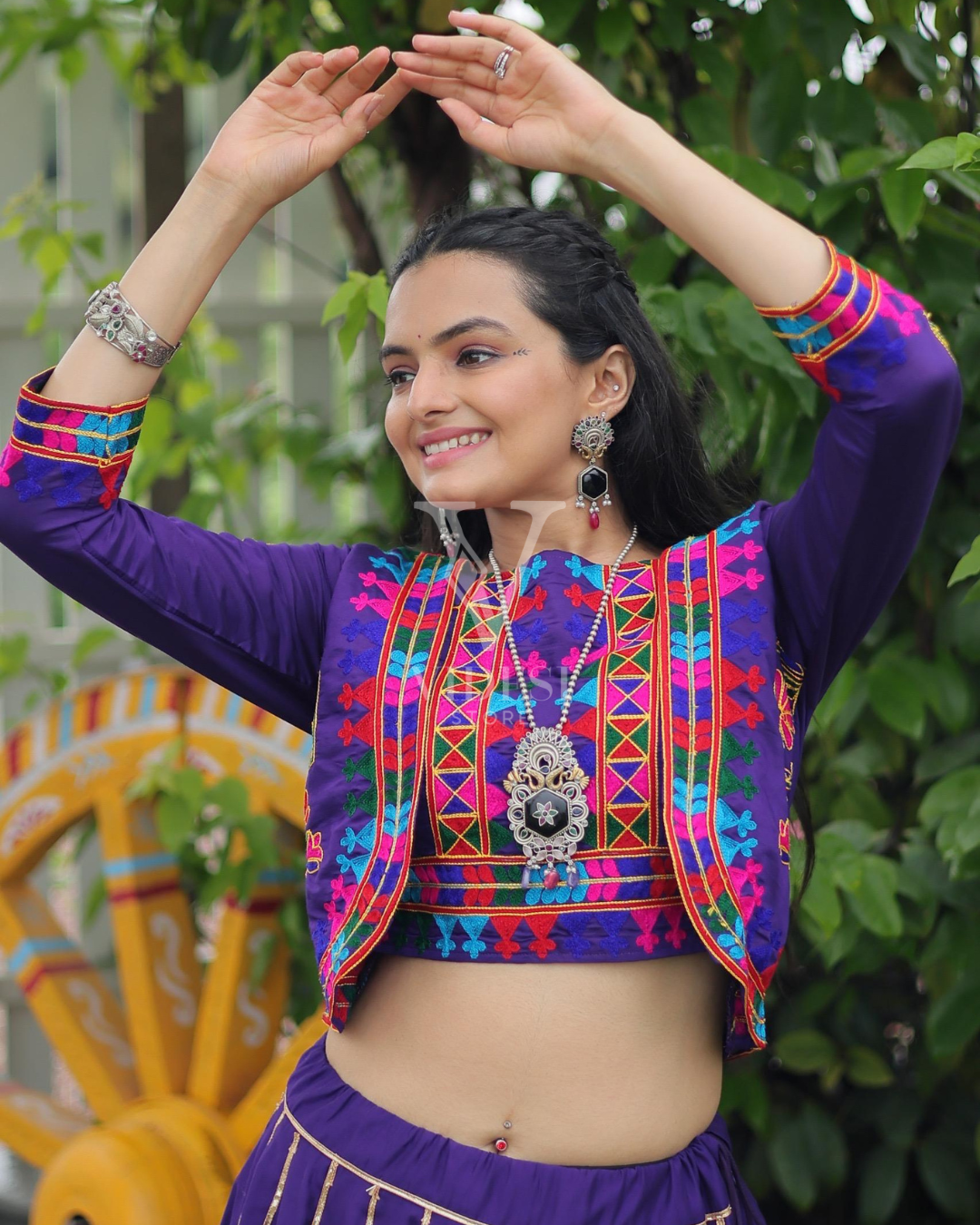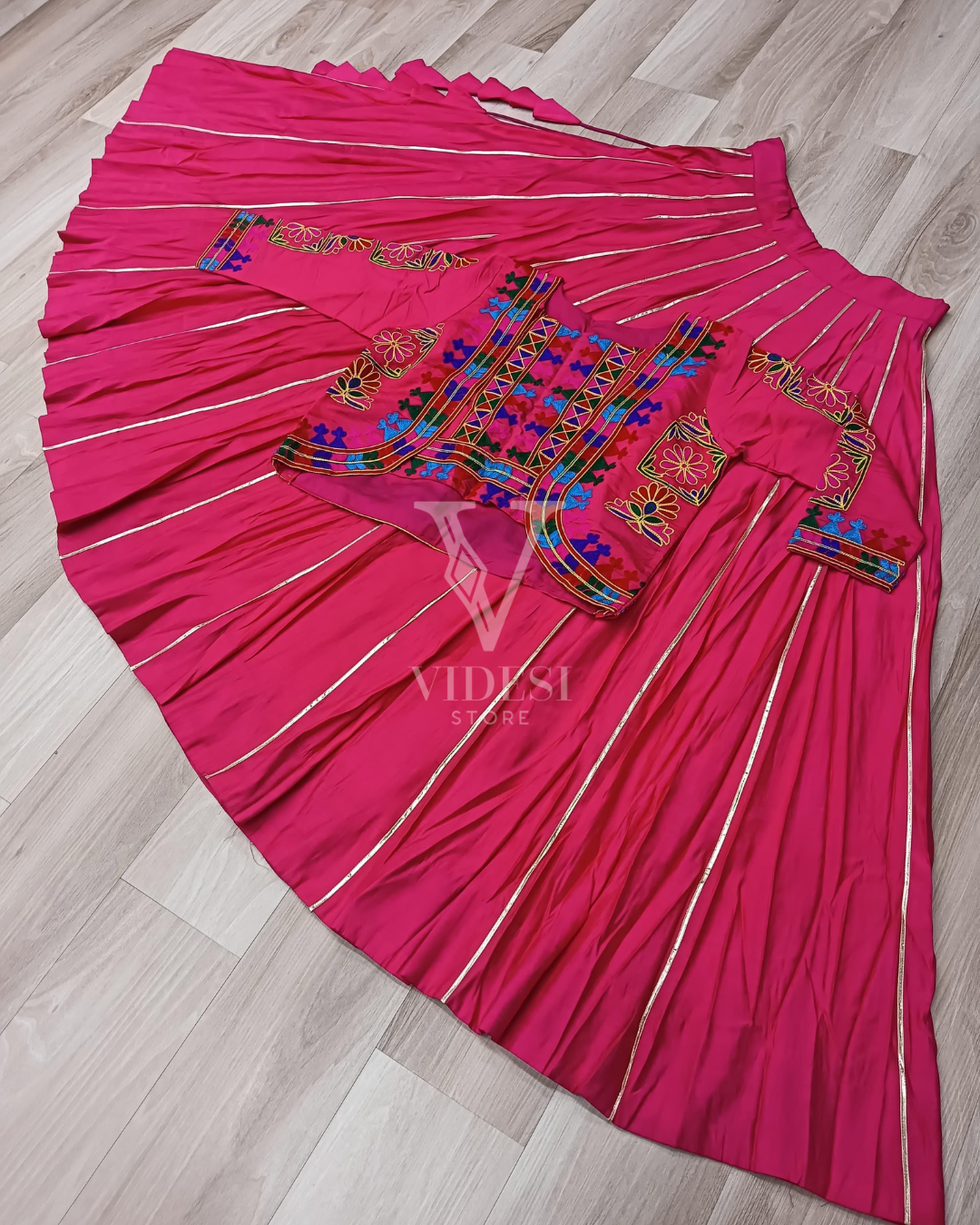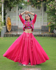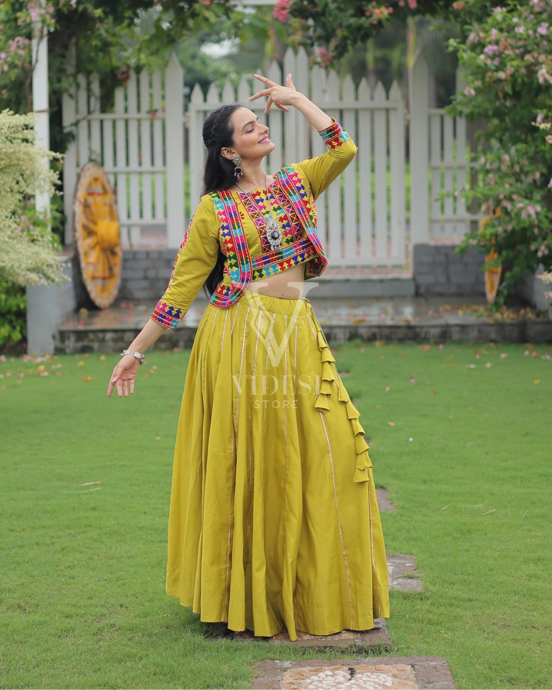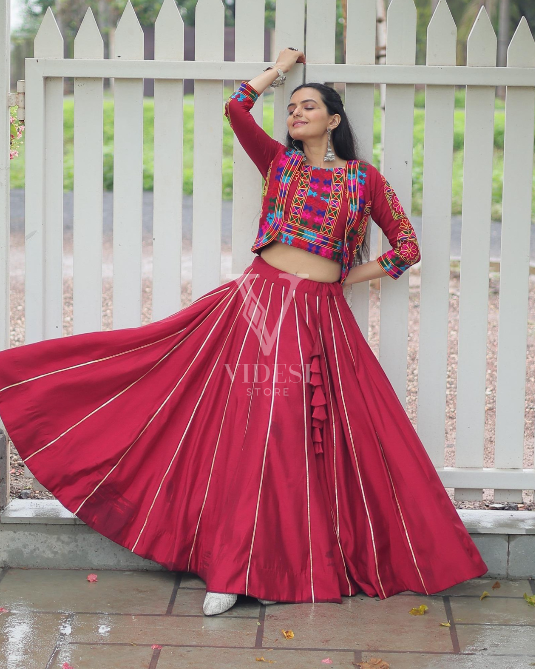 Celebrate Sunisa Roman Gotta-Patti Lehenga with the colorful charm of this embroidered piece, designed to light up every garba and dandiya night. Its detailed embroidery adds sparkle to every twirl, making your dance moves stand out. Perfect for girls and women ready to blend tradition with festive fun!