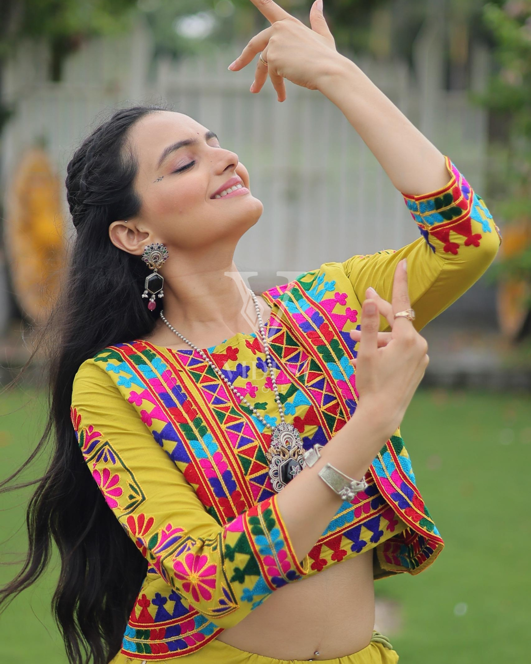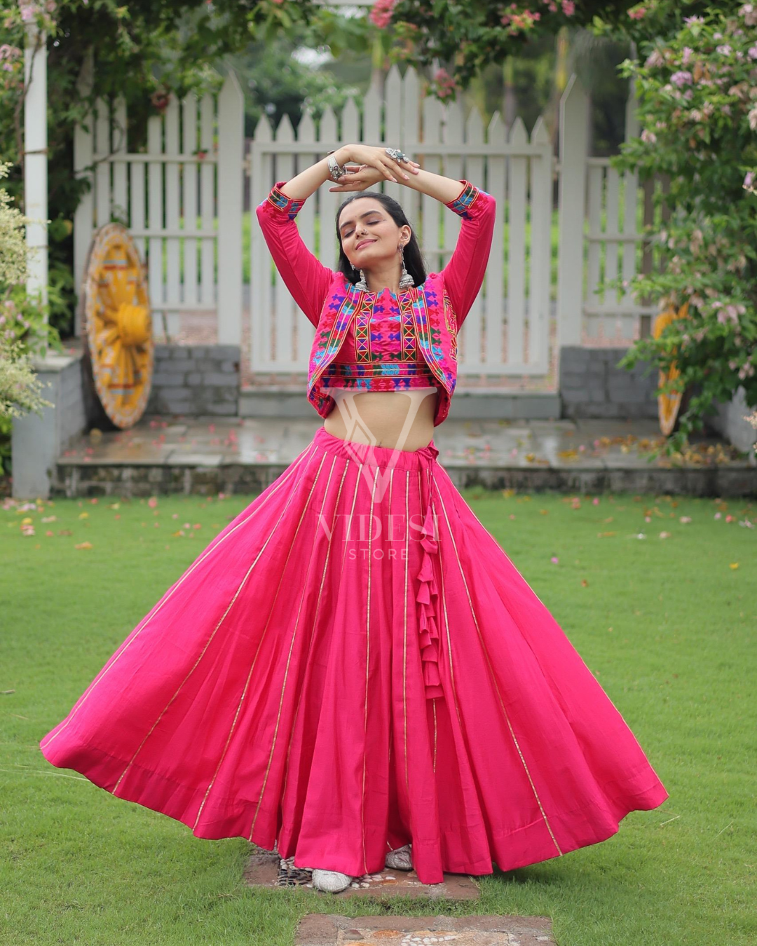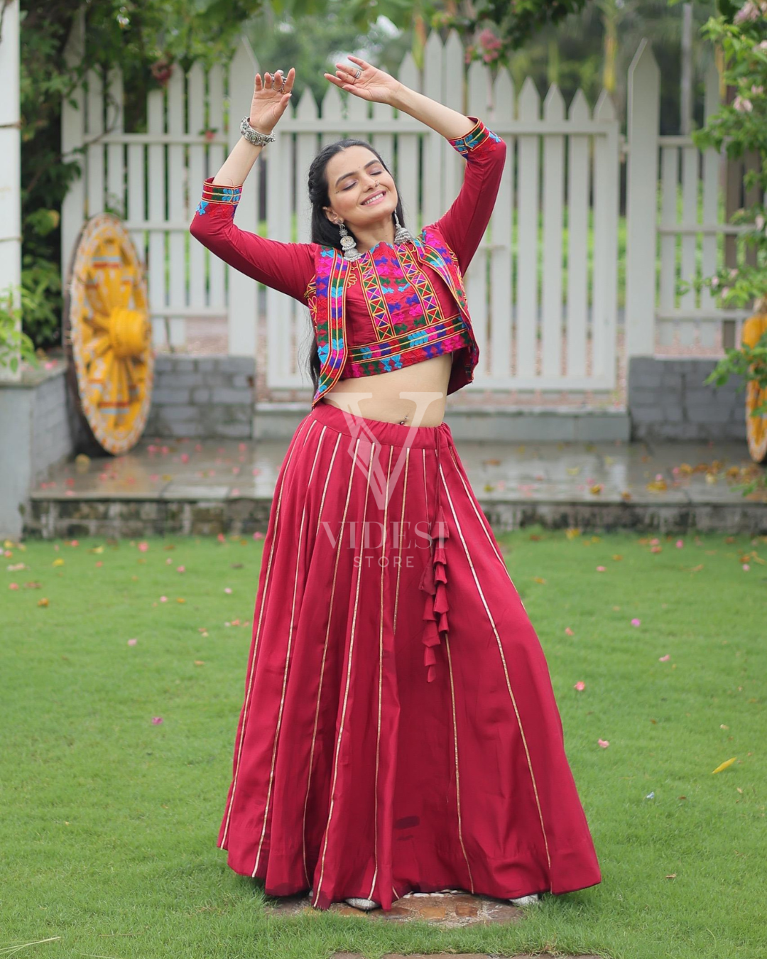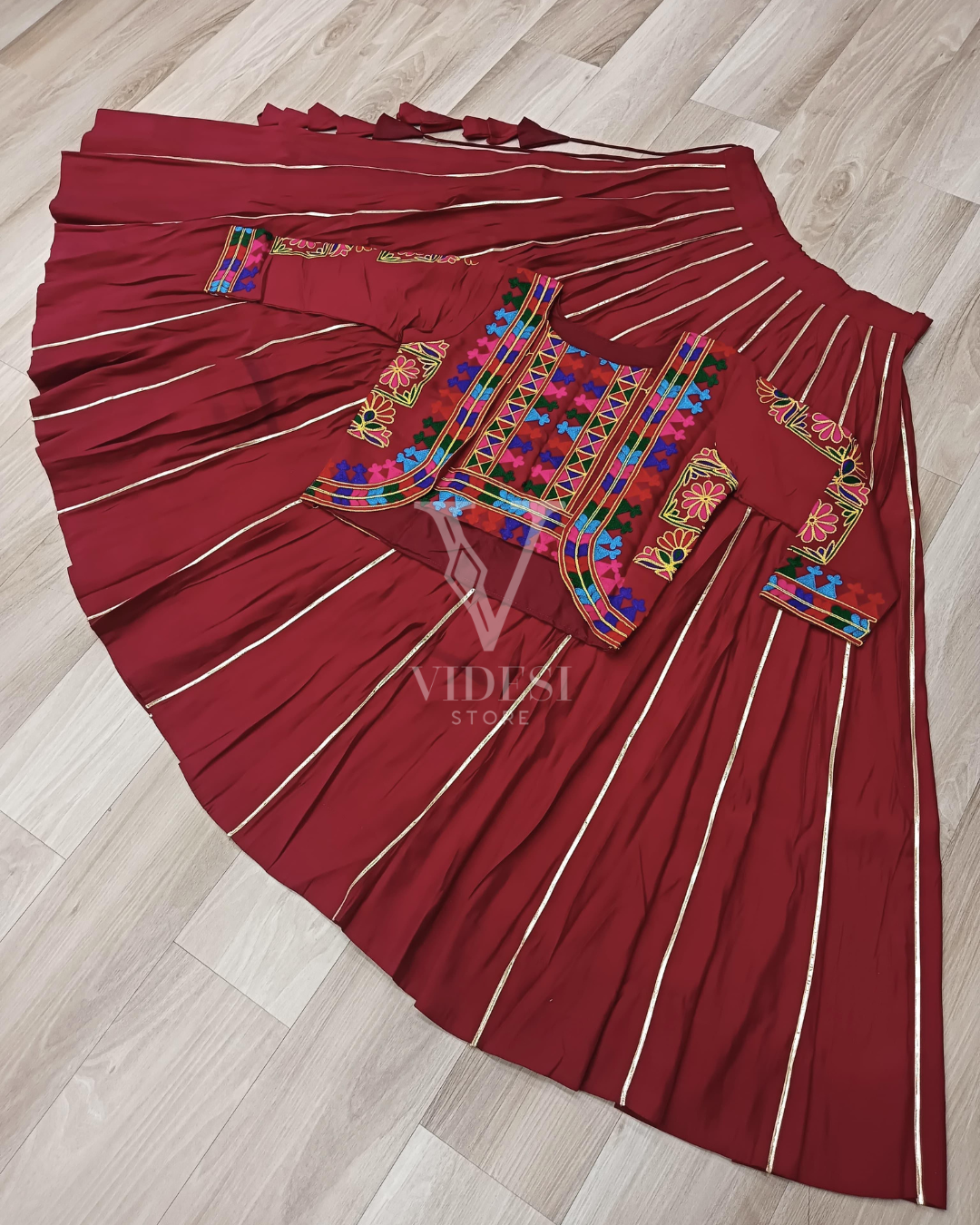 Celebrate Sunisa Roman Gotta-Patti Lehenga with the colorful charm of this embroidered piece, designed to light up every garba and dandiya night. Its detailed embroidery adds sparkle to every twirl, making your dance moves stand out. Perfect for girls and women ready to blend tradition with festive fun!