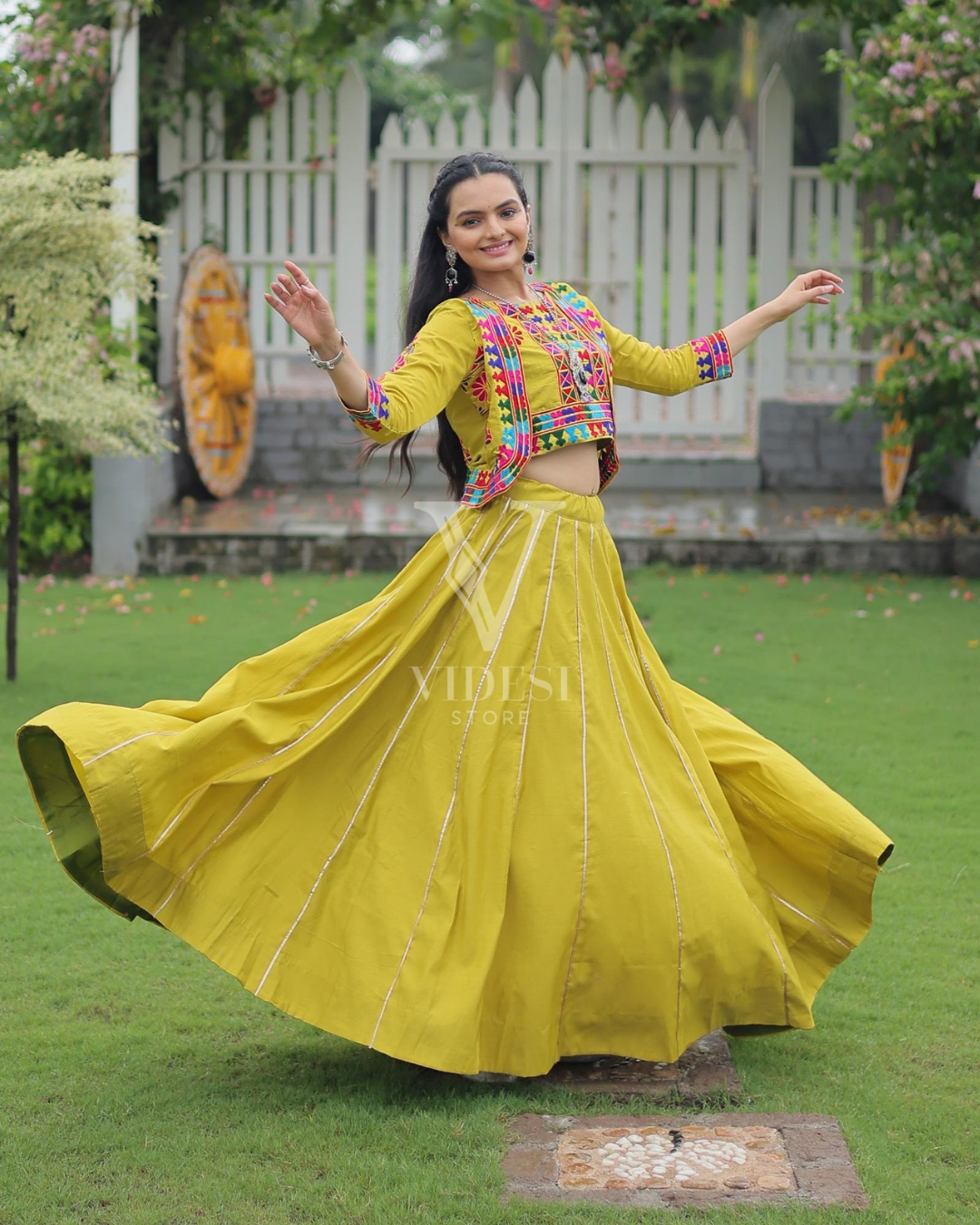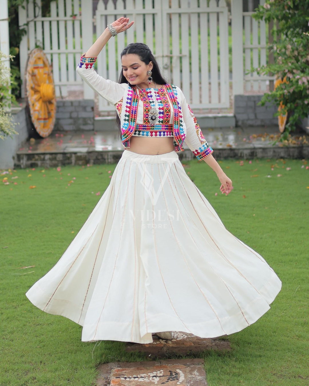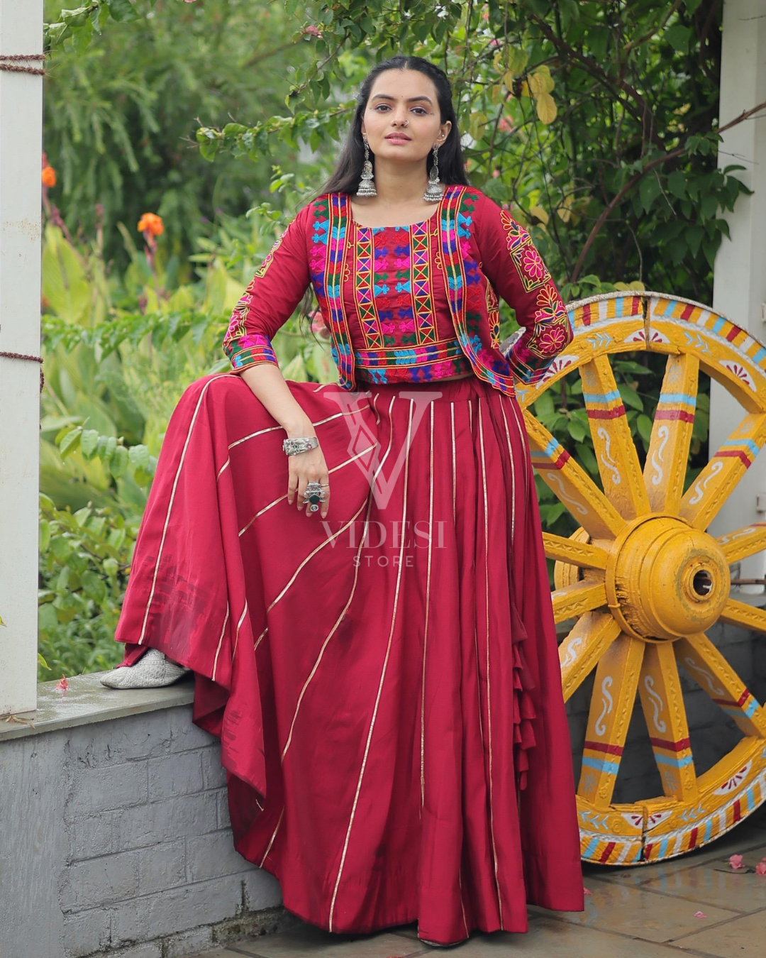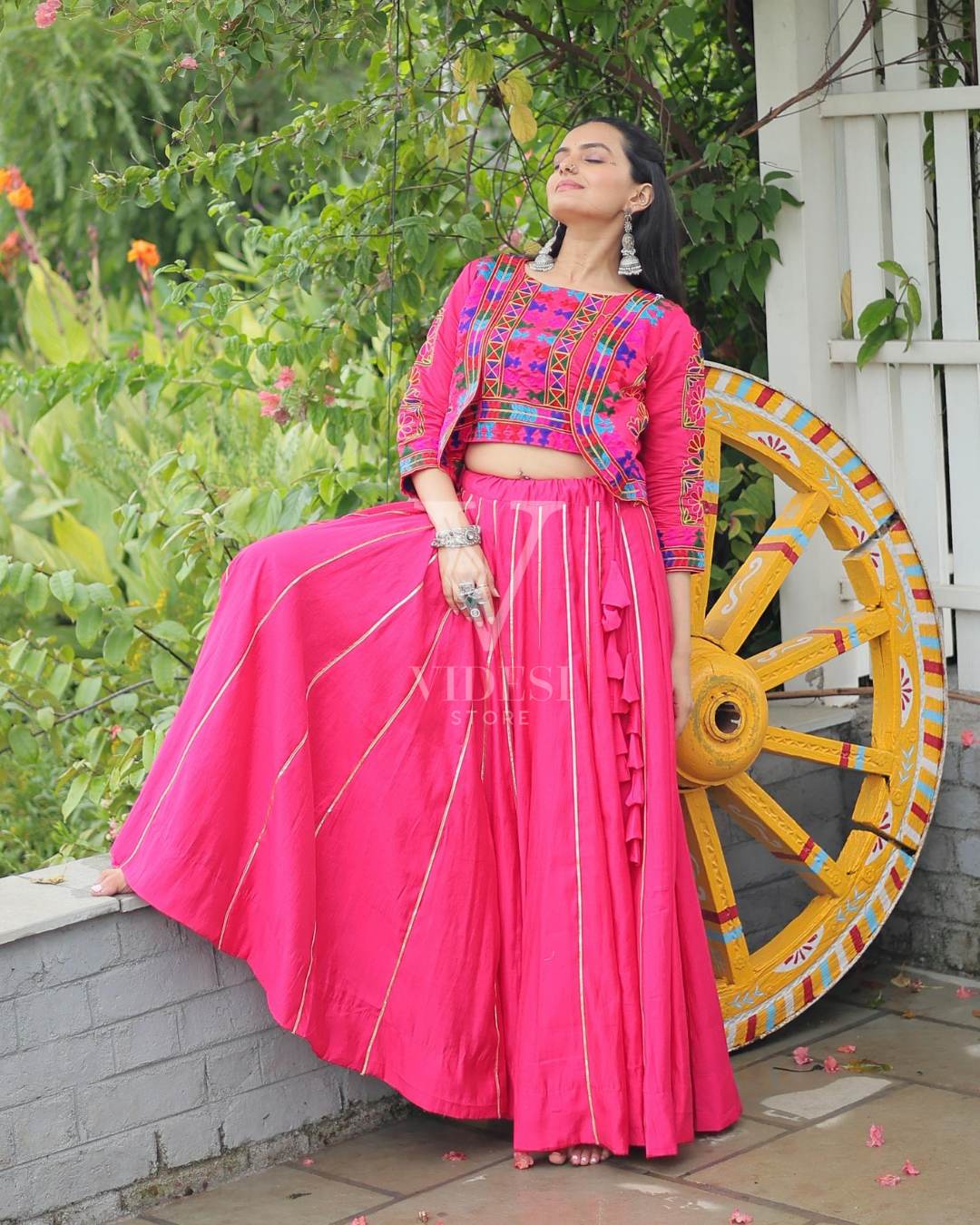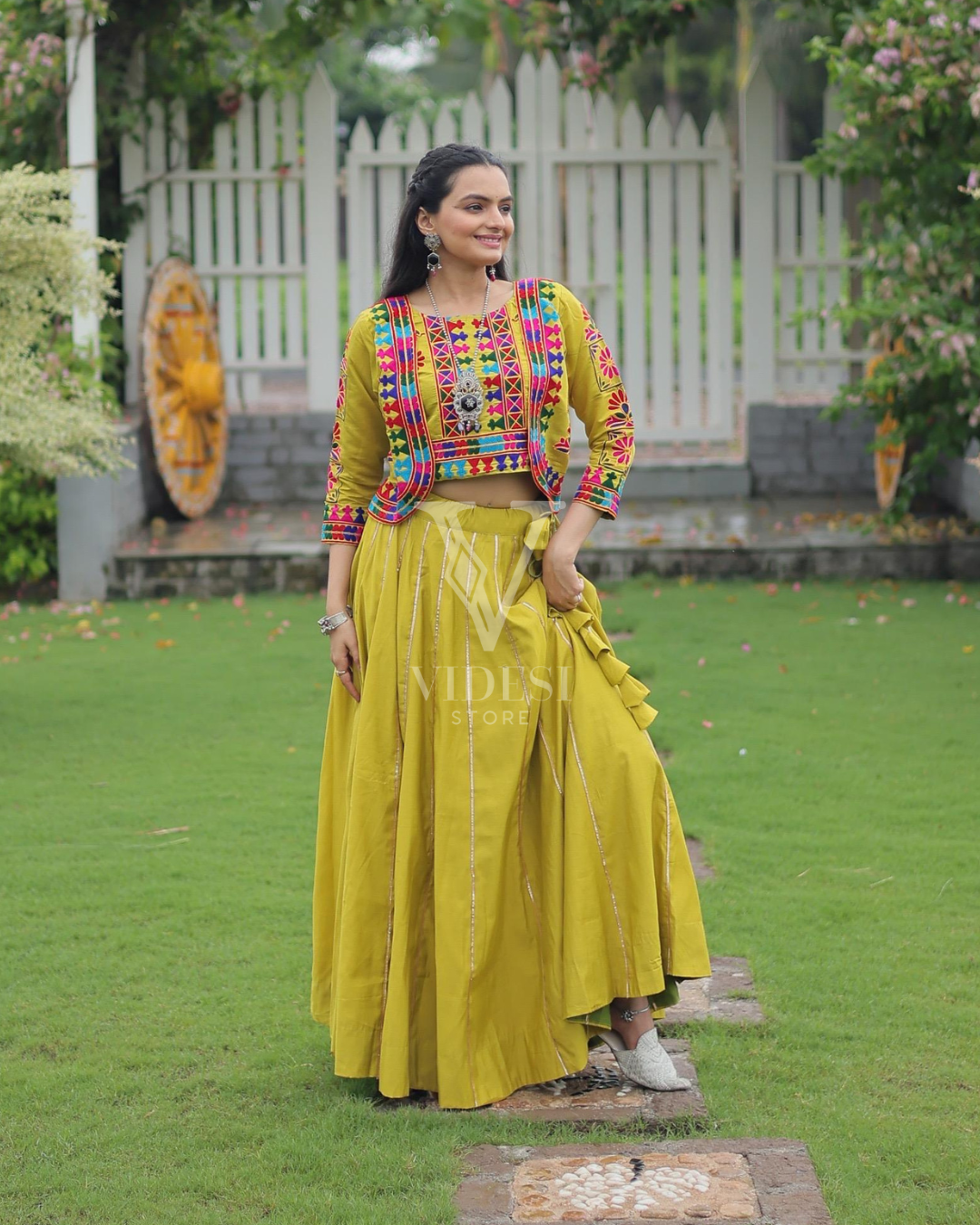 Celebrate Sunisa Roman Gotta-Patti Lehenga with the colorful charm of this embroidered piece, designed to light up every garba and dandiya night. Its detailed embroidery adds sparkle to every twirl, making your dance moves stand out. Perfect for girls and women ready to blend tradition with festive fun!