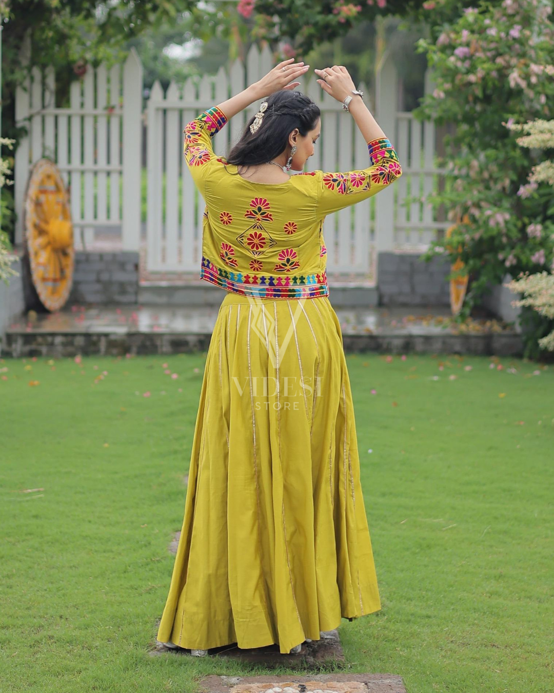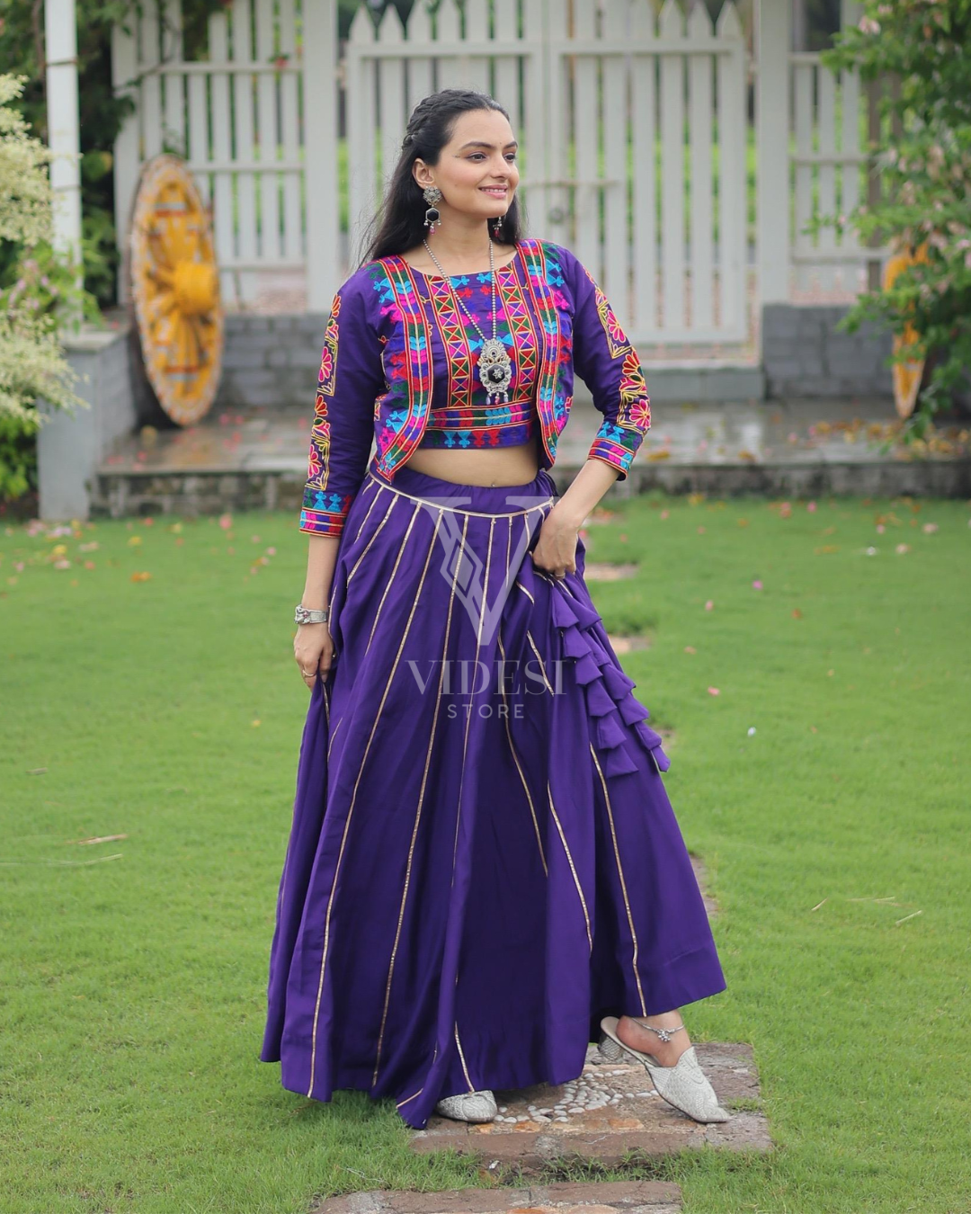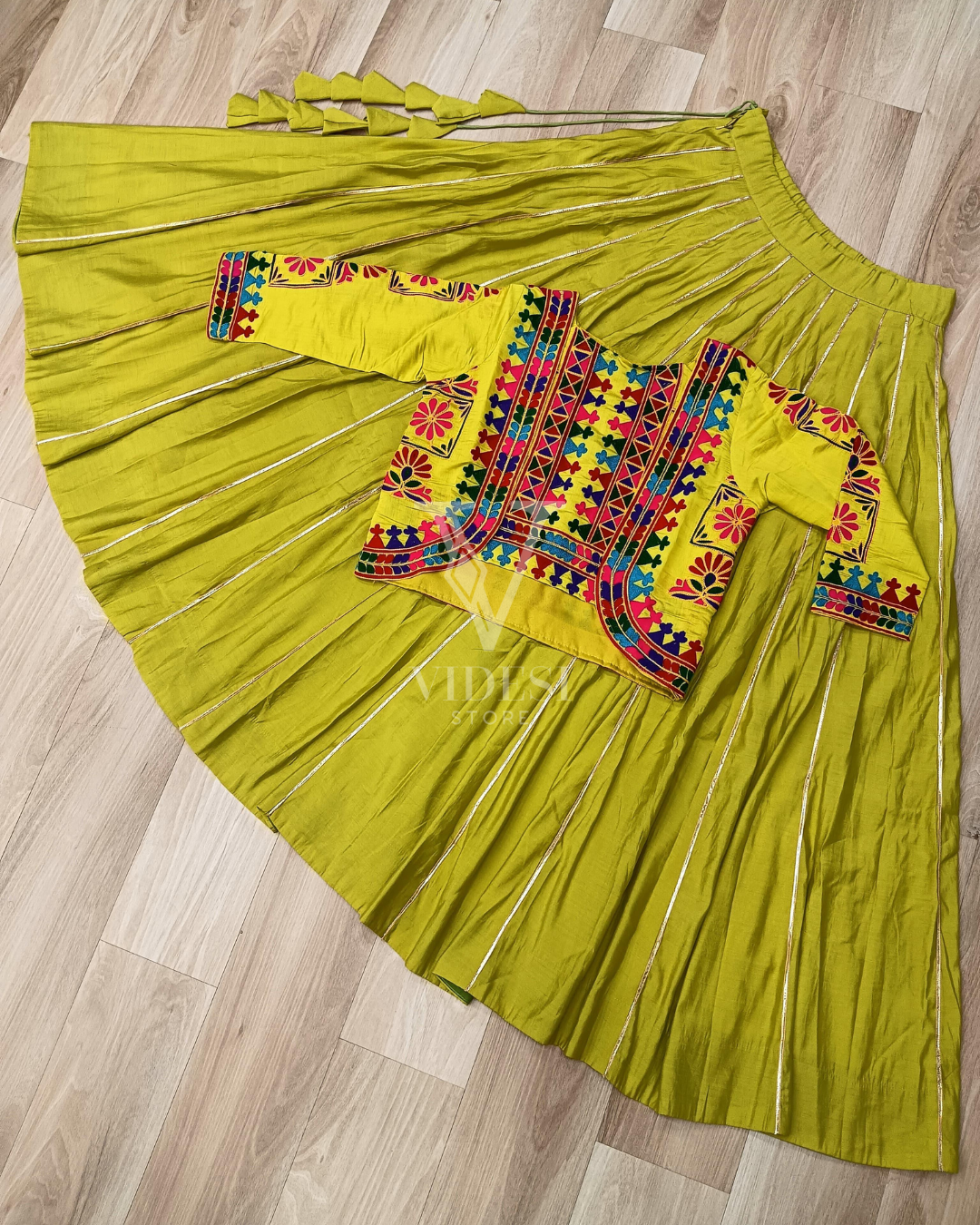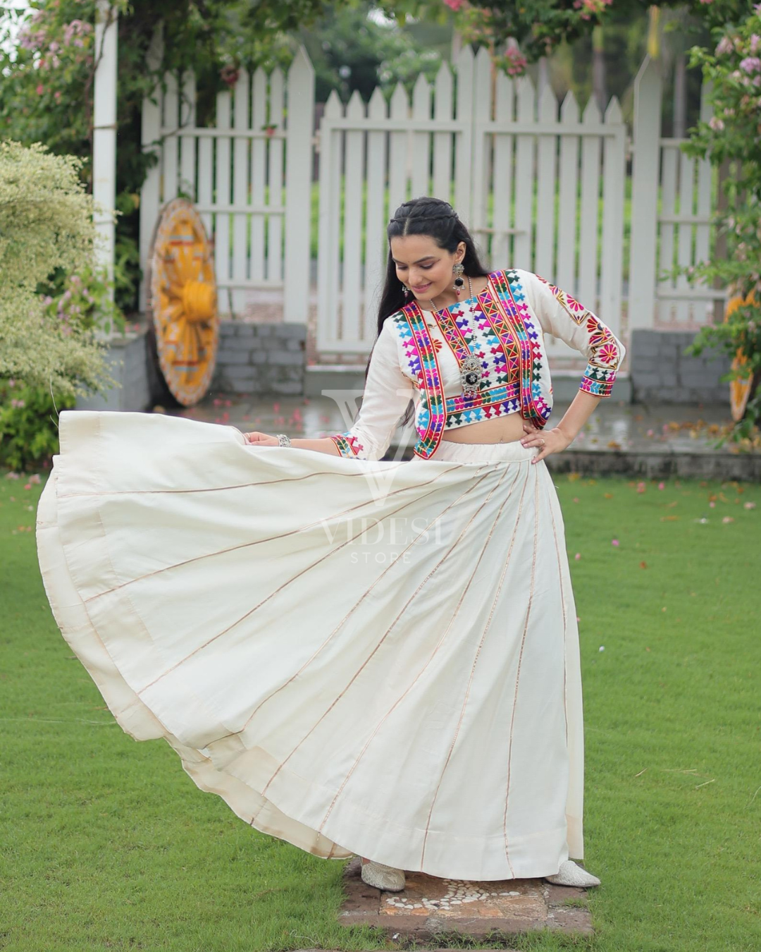 Celebrate Sunisa Roman Gotta-Patti Lehenga with the colorful charm of this embroidered piece, designed to light up every garba and dandiya night. Its detailed embroidery adds sparkle to every twirl, making your dance moves stand out. Perfect for girls and women ready to blend tradition with festive fun!